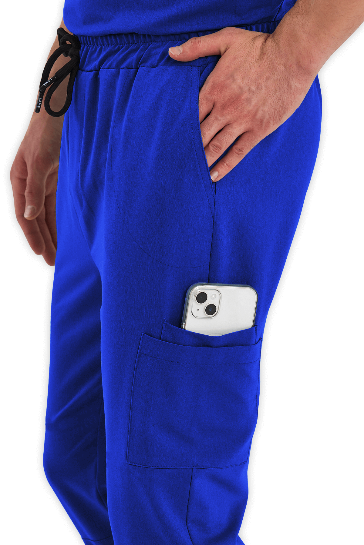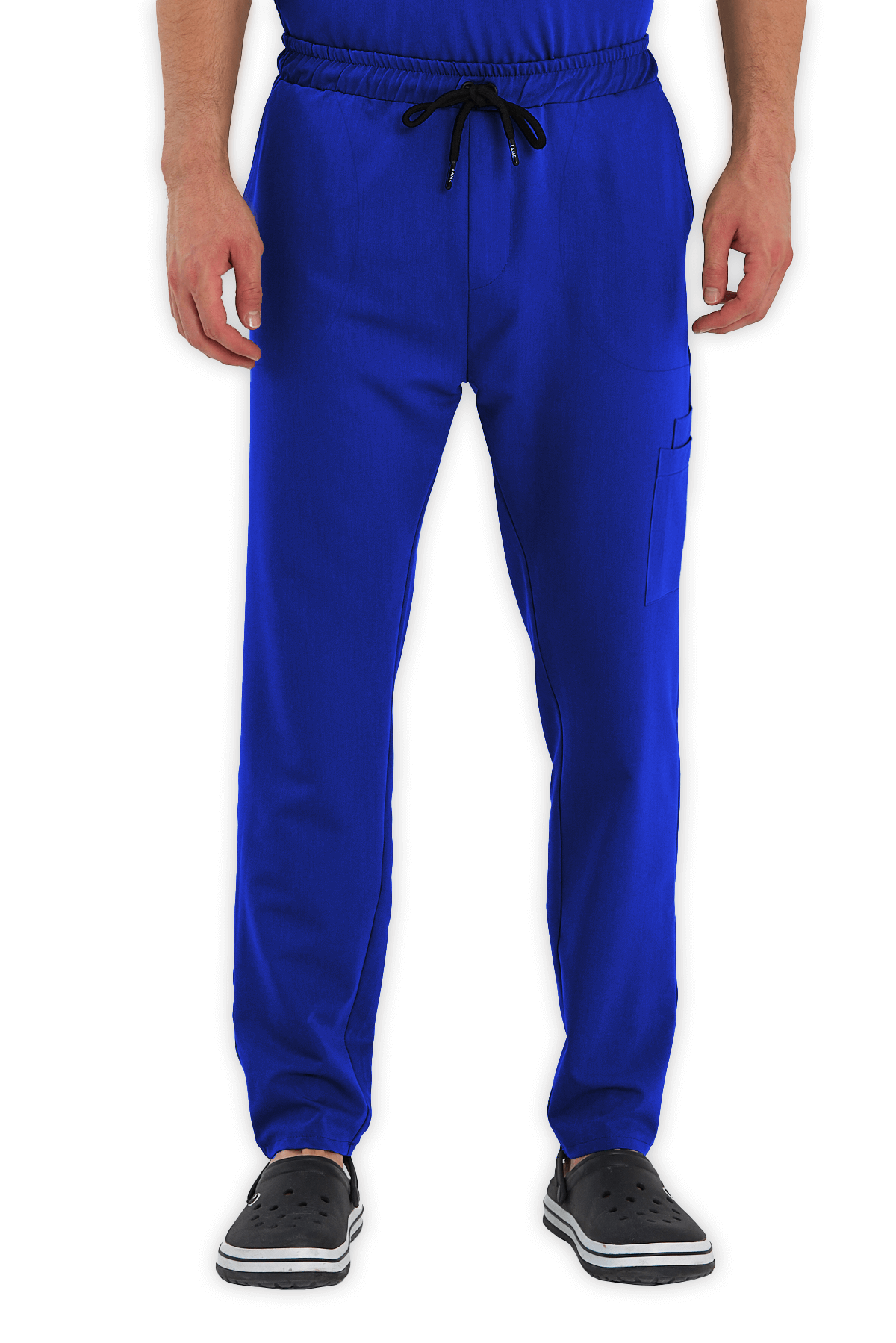 Fonksiyonel Erkek Scrubs Pantolon Kargo Cepli – Saks Mavisi, beli lastikli ve bağcıklı yapısıyla rahatlık sağlar. 2 yan cep, 1 arka cep ve 2’li kargo cebi ile sağlık çalışanları için maksimum işlevsellik!