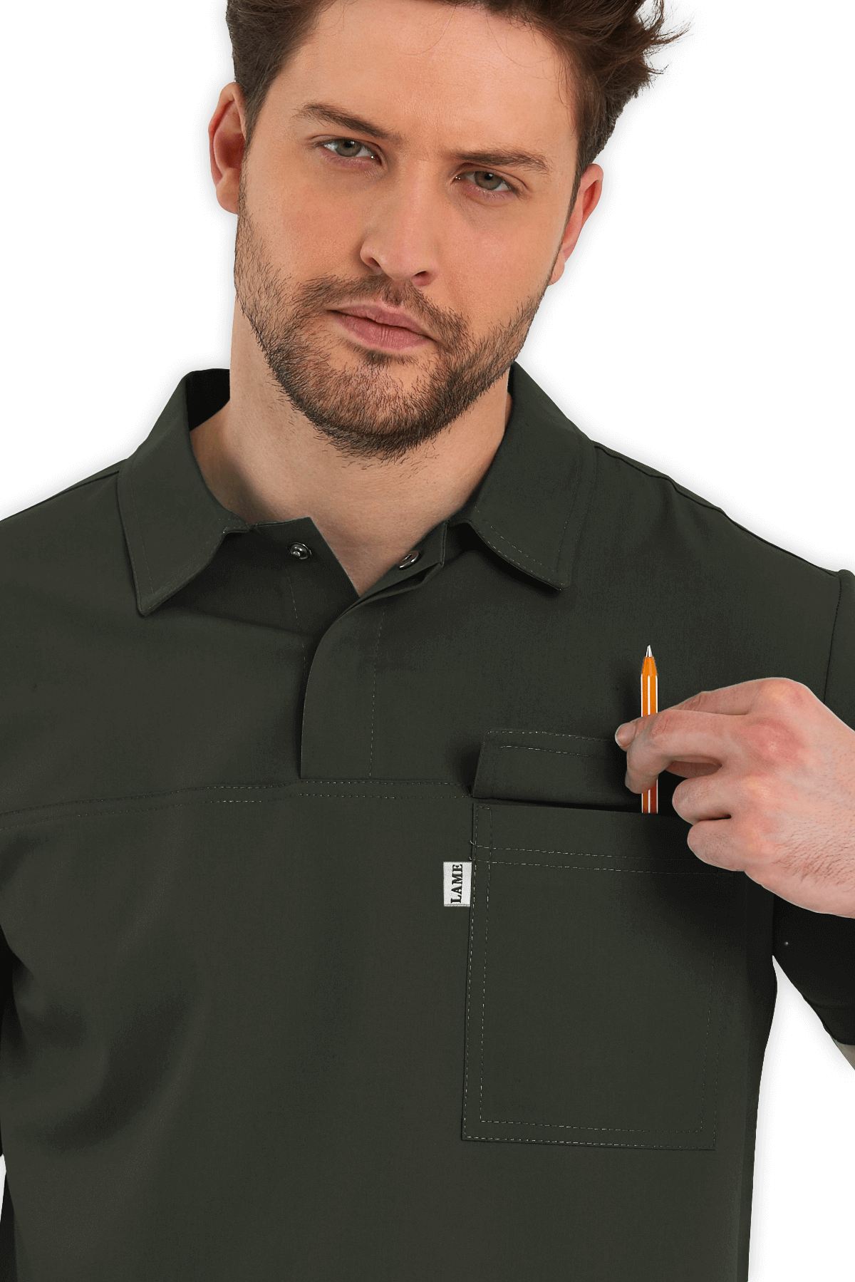 Şık Erkek Scrubs Üst Polo Yaka – Haki, 1 kapaklı göğüs cebi, 1 kol cebi ve yırtmaçlı tasarımıyla konfor ve tarzı birleştirir. Sağlık çalışanları için gün boyu rahatlık!
