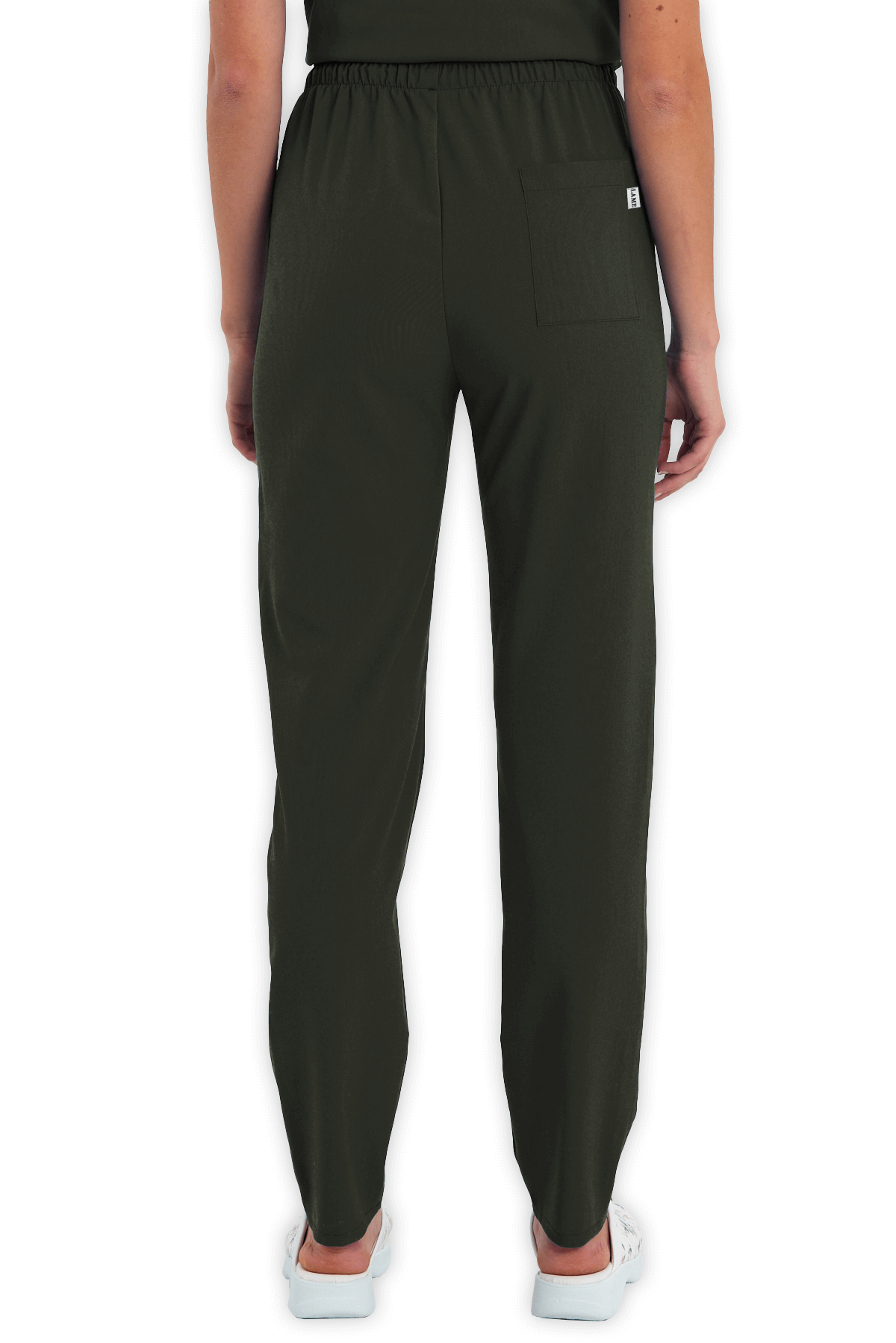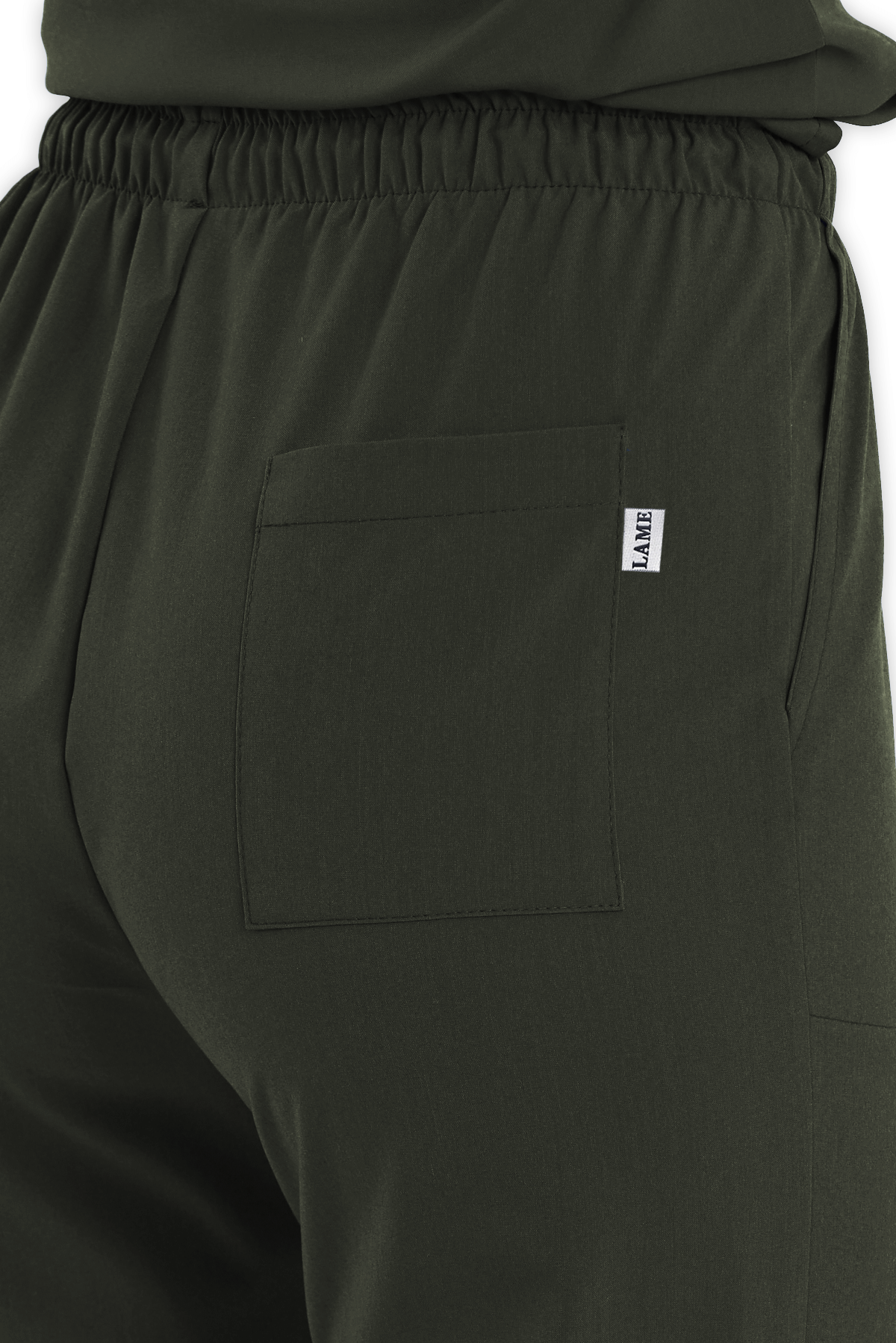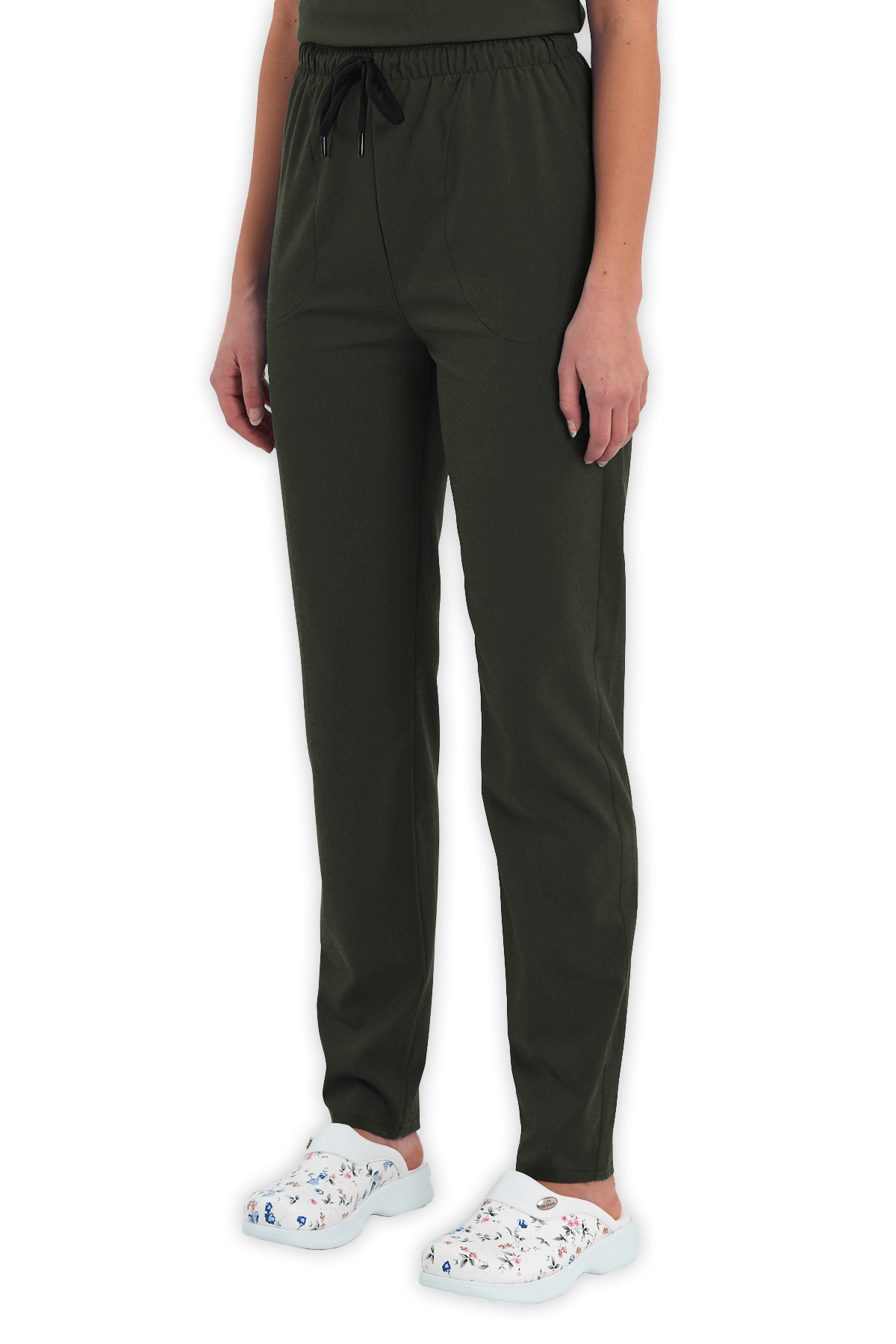 Rahat Kadın Scrubs Pantolon – Haki, beli lastikli ve bağcıklı tasarımıyla sağlık çalışanlarına hareket özgürlüğü sağlar. 2 yan cep ve 1 arka cep ile işlevsel kullanım!