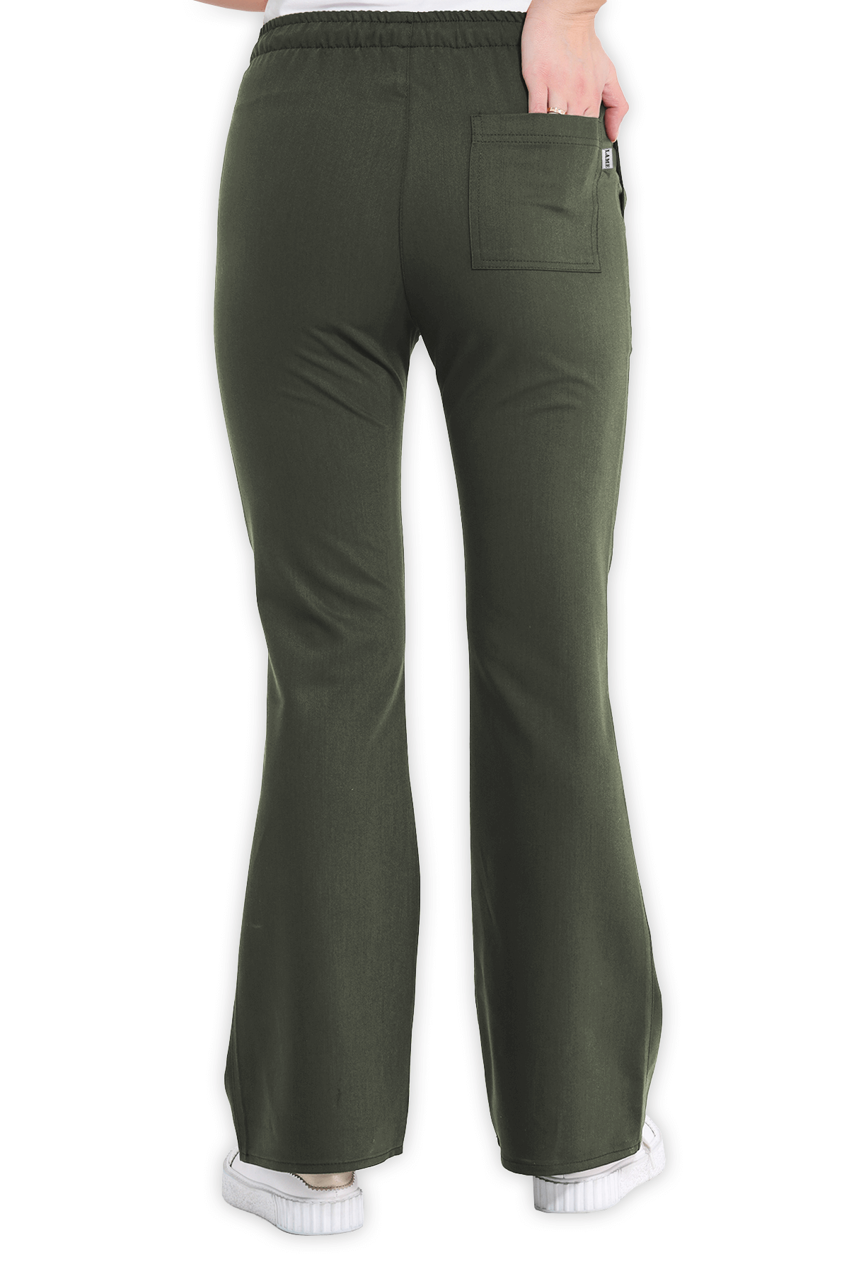 Şık Kadın Scrubs Pantolon İspanyol Paça – Haki, beli lastikli ve bağcıklı tasarımıyla öne çıkar. 2 yan cep, 1 arka cep ve İspanyol paça kesimiyle sağlık çalışanları için zarif bir görünüm!