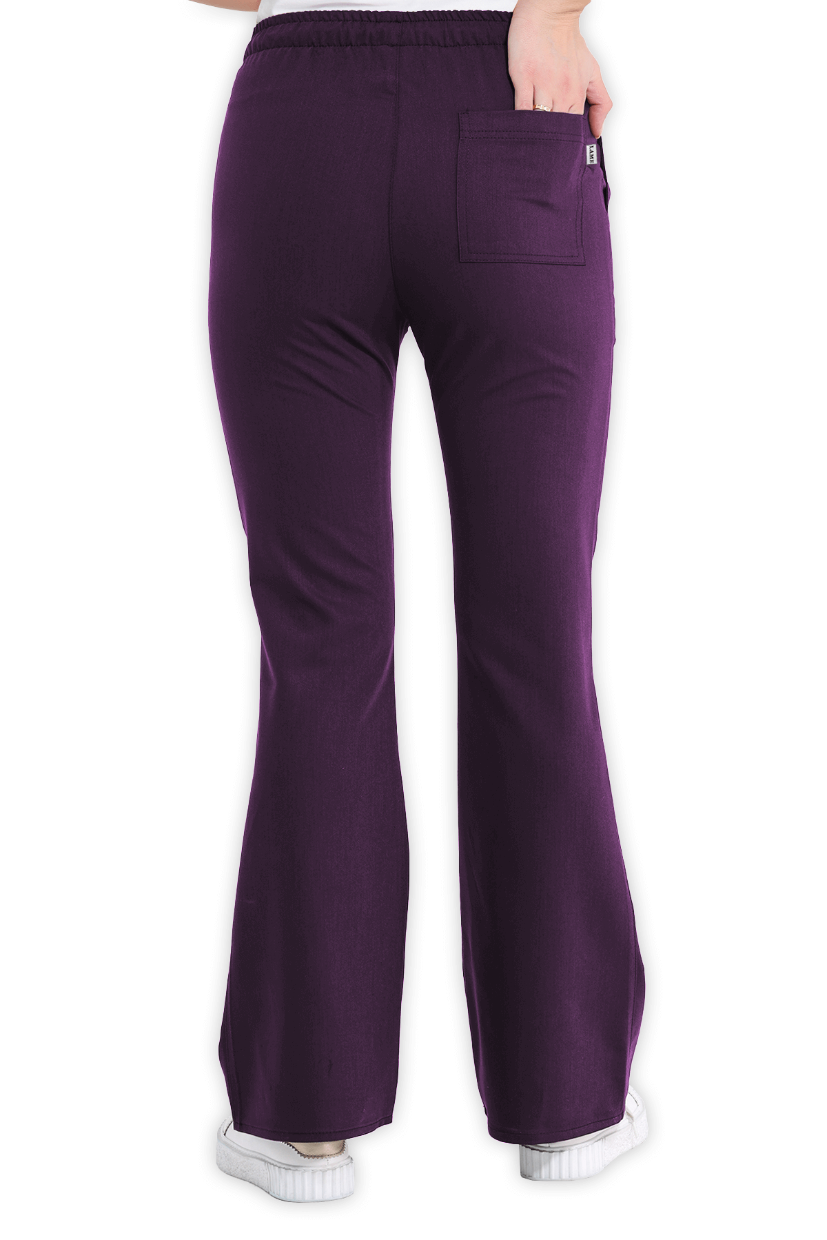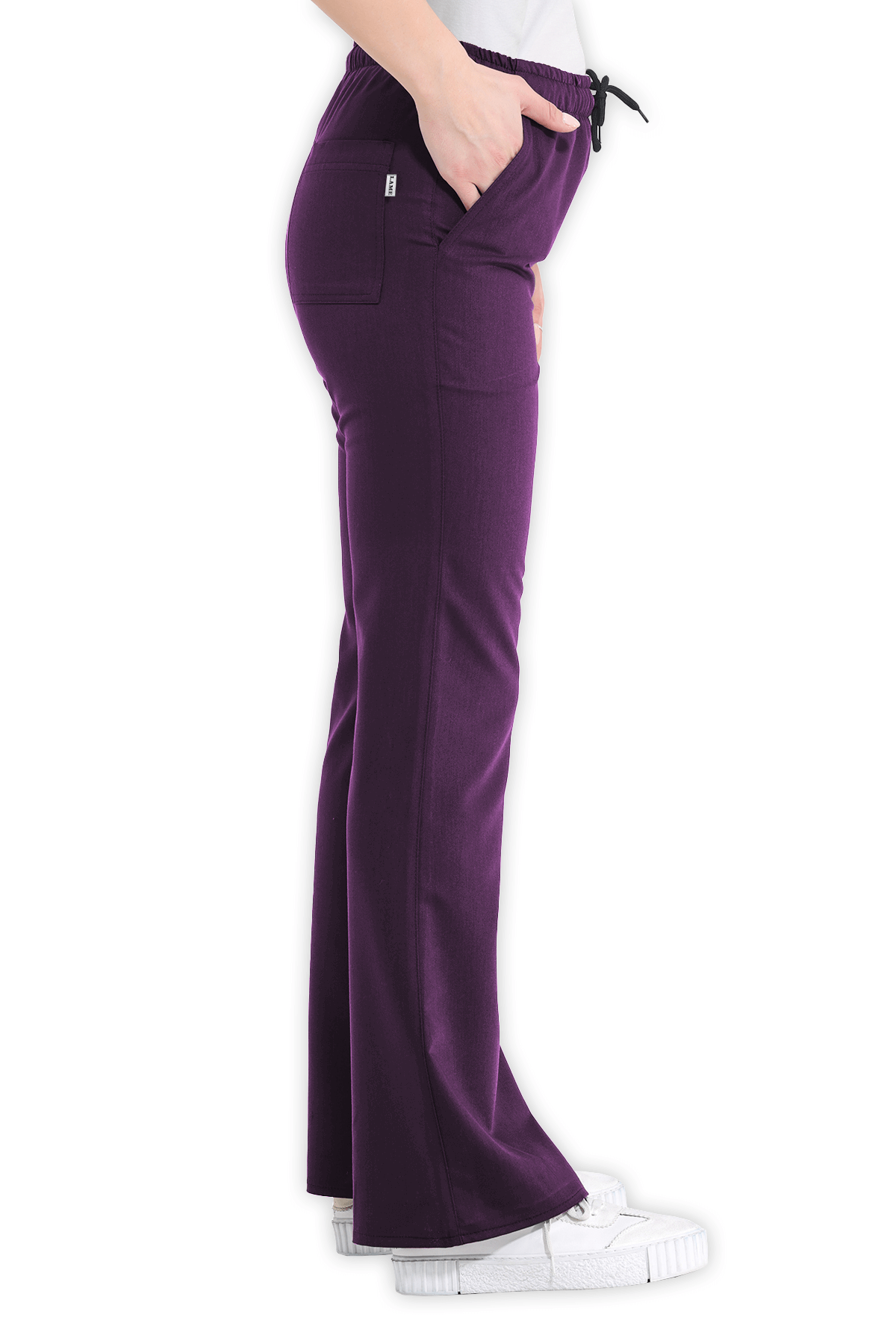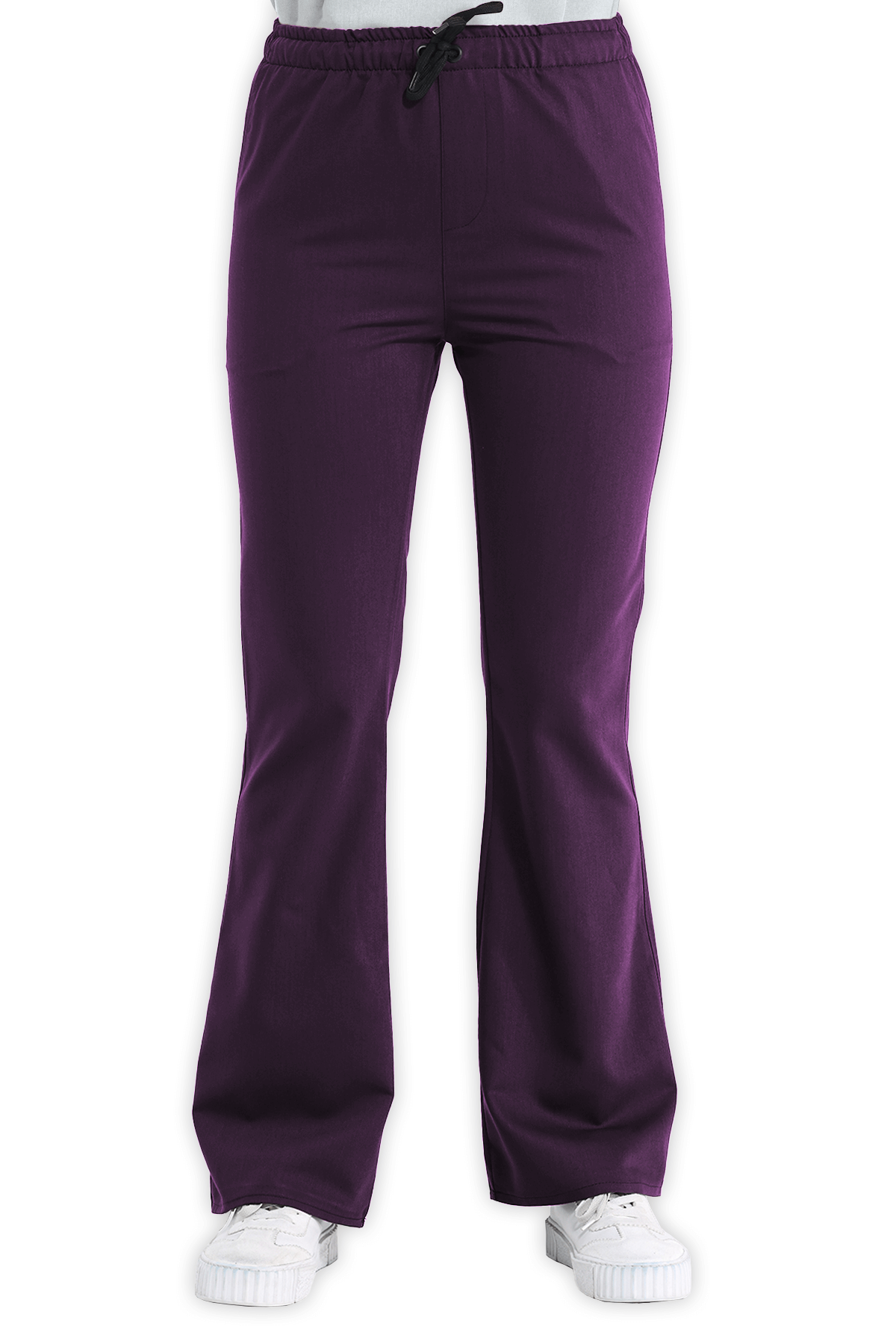 Şık Kadın Scrubs Pantolon İspanyol Paça – Mürdüm, beli lastikli ve bağcıklı tasarımıyla öne çıkar. 2 yan cep, 1 arka cep ve İspanyol paça kesimiyle sağlık çalışanları için zarif bir görünüm!