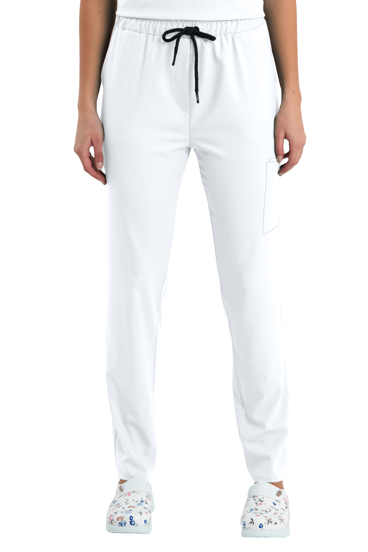 Fonksiyonel Kadın Scrubs Pantolon Kargo Cepli – Beyaz, beli lastikli ve bağcıklı yapısıyla konfor sunar. 2 yan cep, 1 arka cep ve 2’li kargo cebi ile sağlık çalışanları için maksimum depolama!