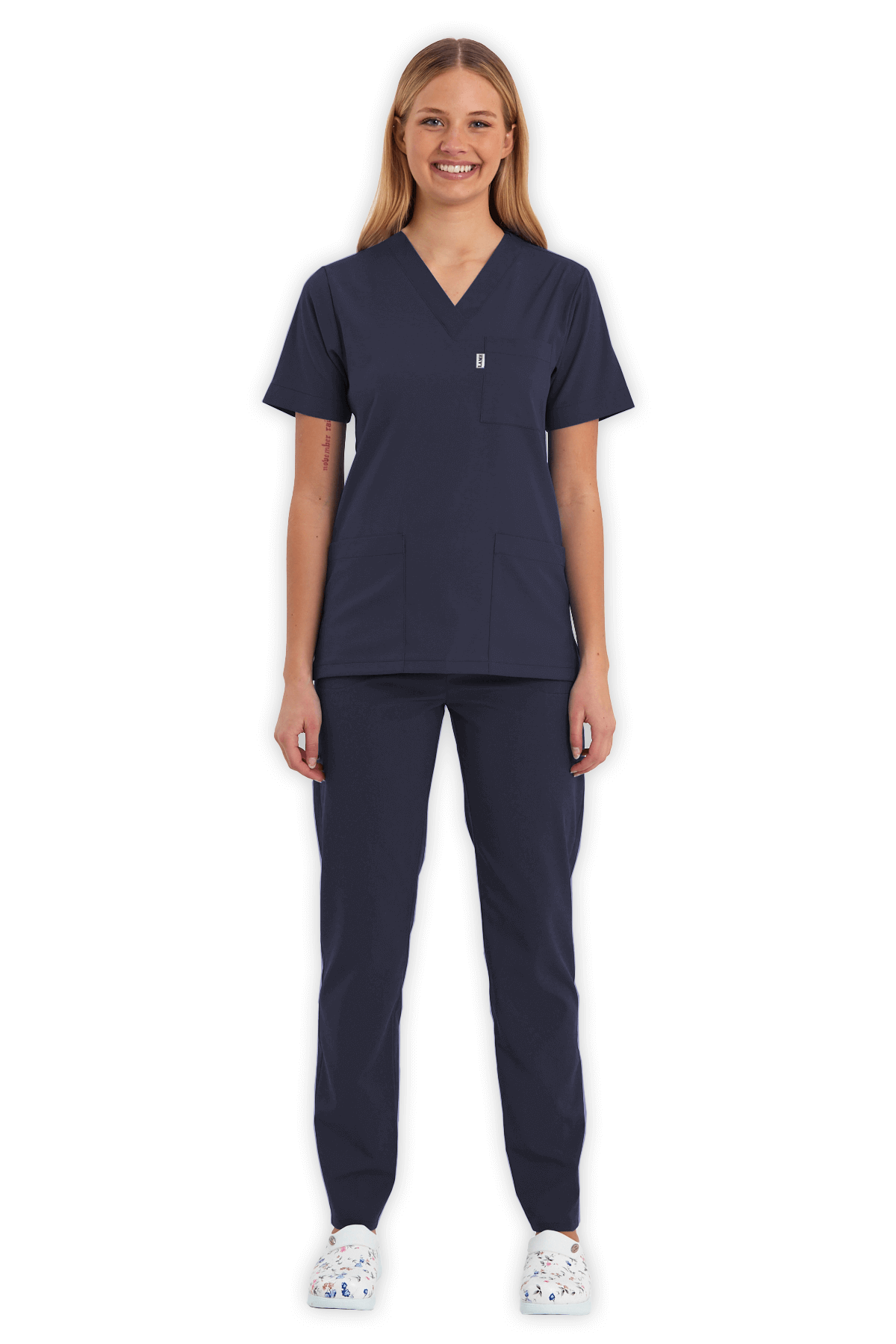 Şık ve konforlu Kadın Scrubs Takım – Antrasit, V yaka üst ve beli lastikli pantolon ile hareket özgürlüğü sunar. 1 göğüs cebi, 2 alt cep ve yırtmaçlı tasarım ile sağlık çalışanları için pratik kullanım!