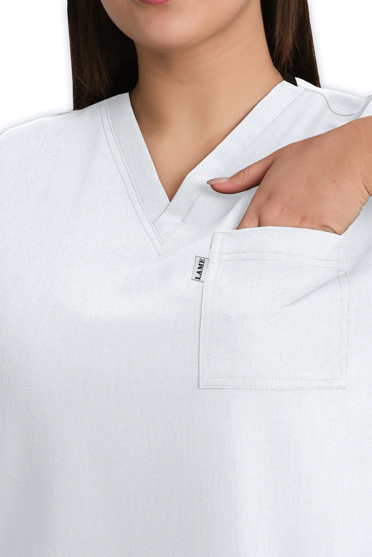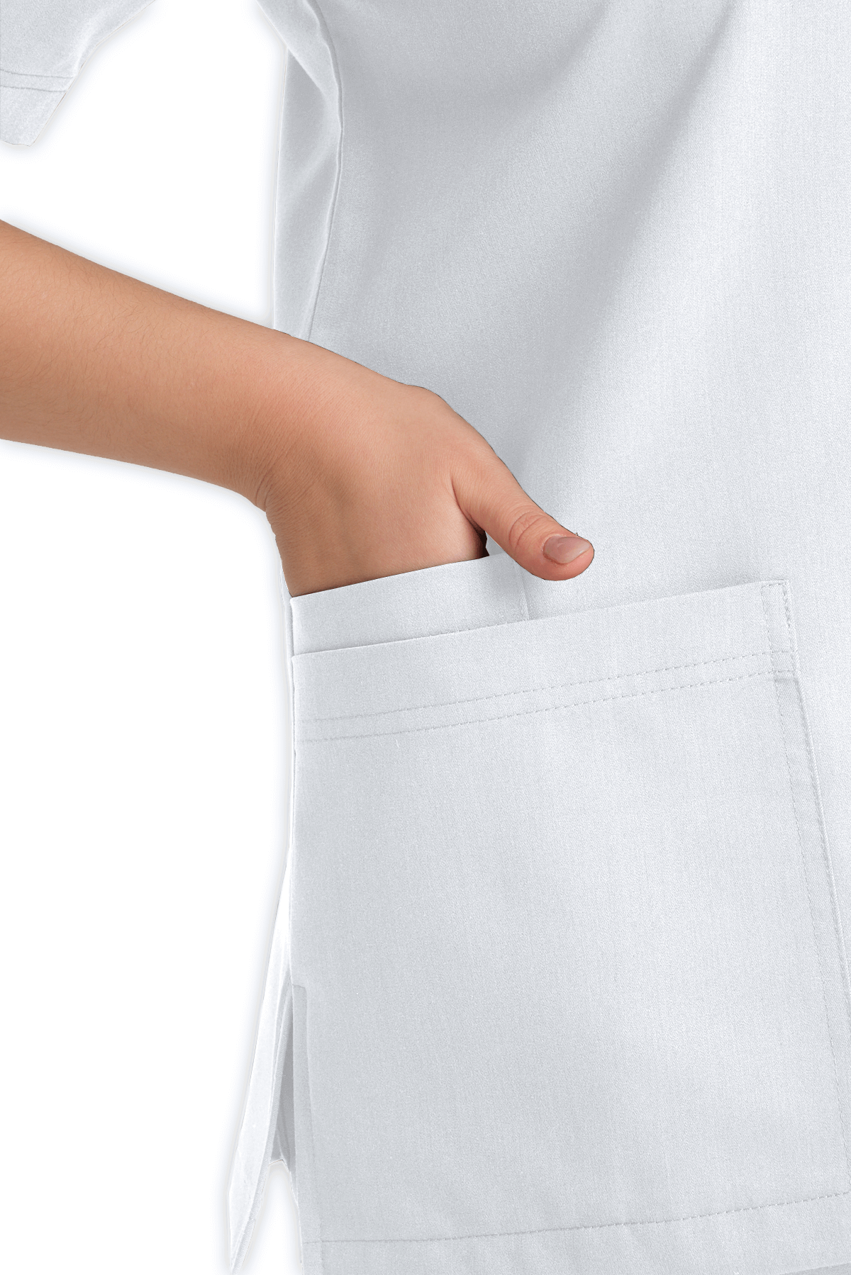 Fonksiyonel Kadın Scrubs Üst 5–Cepli – Beyaz, V yaka, 1 göğüs cebi, 1 kol cebi ve 4 alt cep (1 telefon cebi dahil) ile maksimum pratiklik sunar. Yırtmaçlı tasarım, sağlık çalışanları için yüksek konfor & ergonomik tasarım!
