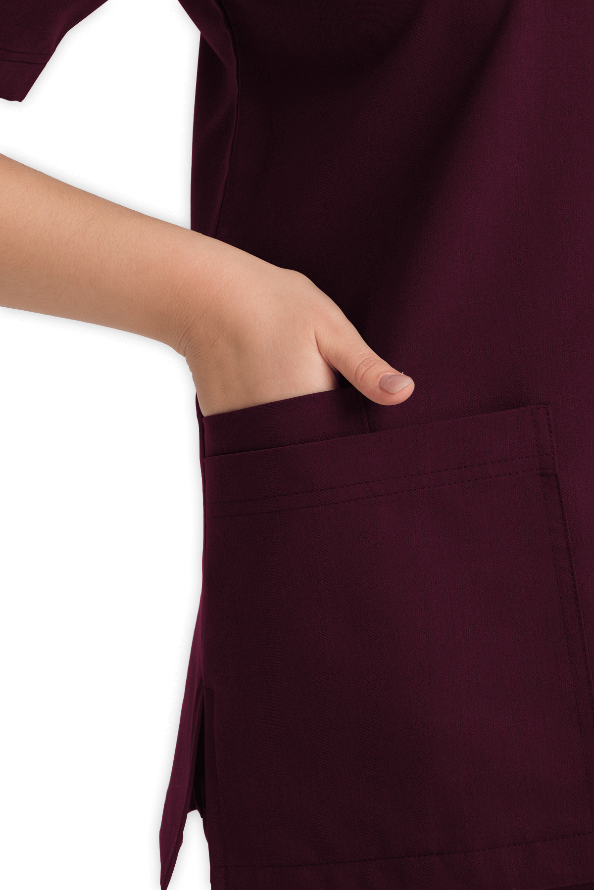 Fonksiyonel Kadın Scrubs Üst 5–Cepli – Bordo, V yaka, 1 göğüs cebi, 1 kol cebi ve 4 alt cep (1 telefon cebi dahil) ile maksimum pratiklik sunar. Yırtmaçlı tasarım, sağlık çalışanları için yüksek konfor & ergonomik tasarım!