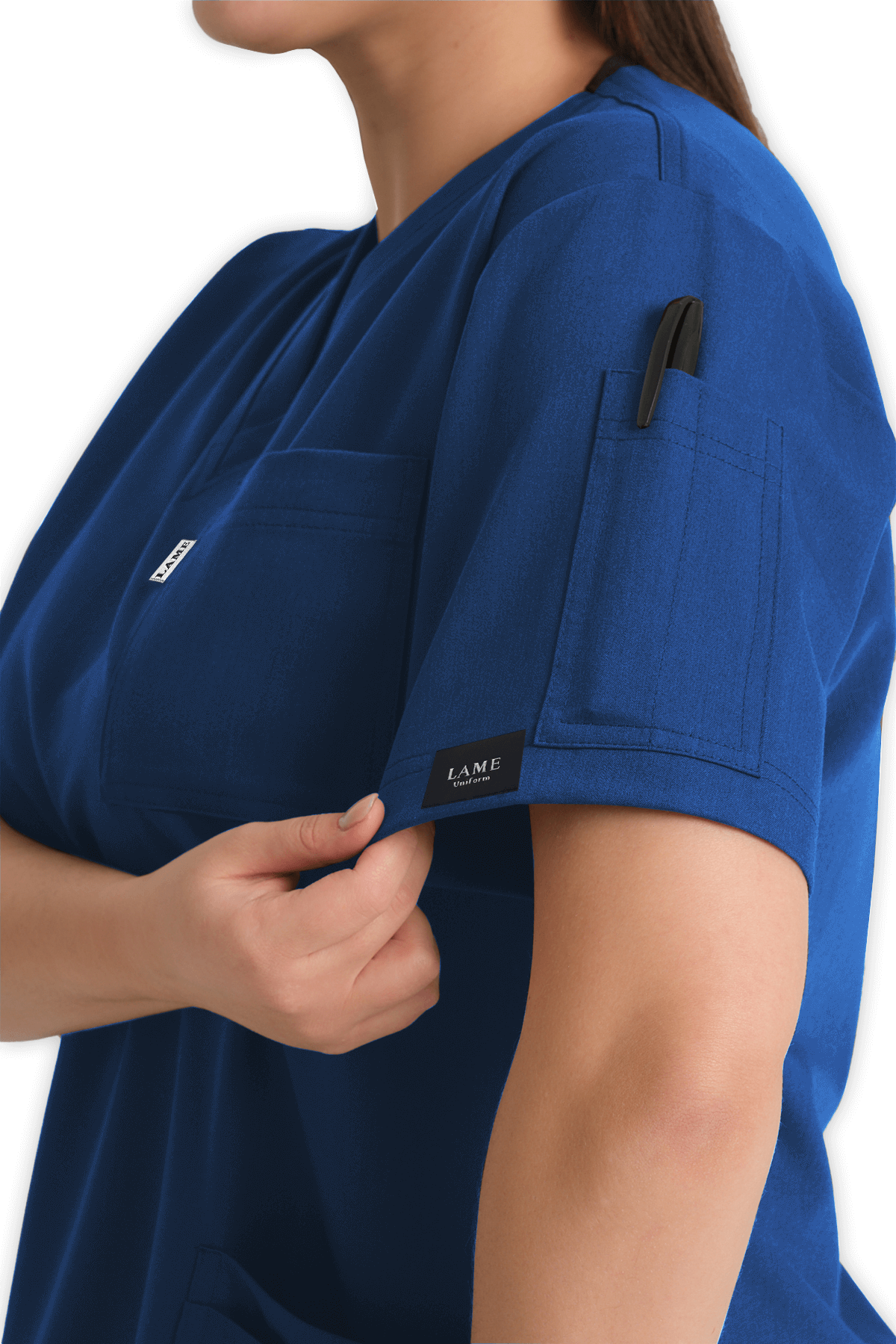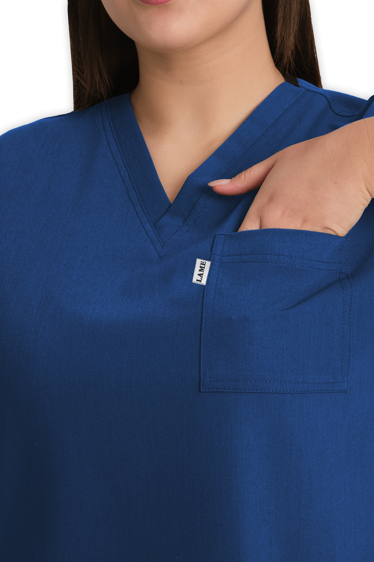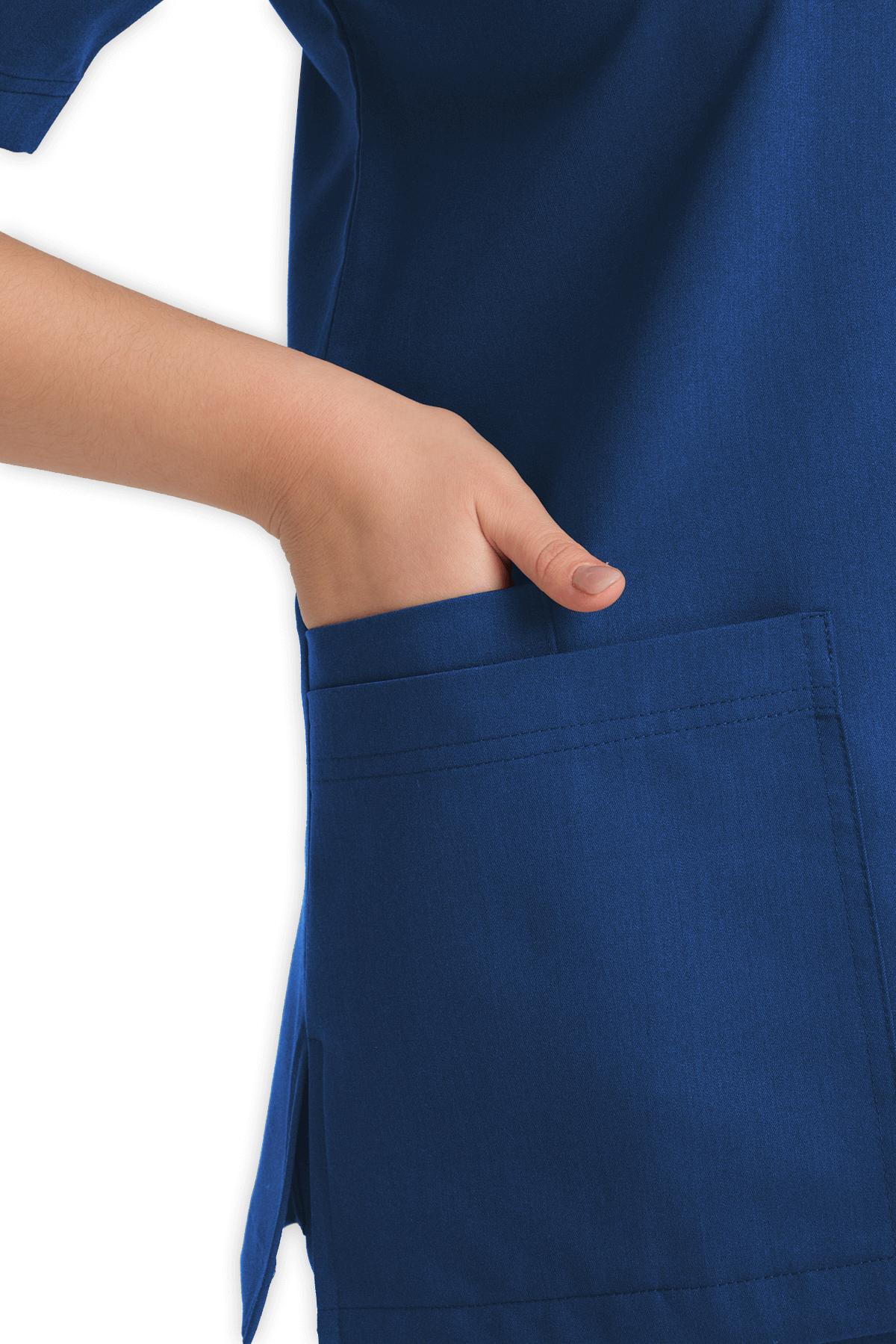 Fonksiyonel Kadın Scrubs Üst 5–Cepli – Petrol Mavisi, V yaka, 1 göğüs cebi, 1 kol cebi ve 4 alt cep (1 telefon cebi dahil) ile maksimum pratiklik sunar. Yırtmaçlı tasarım, sağlık çalışanları için yüksek konfor & ergonomik tasarım!