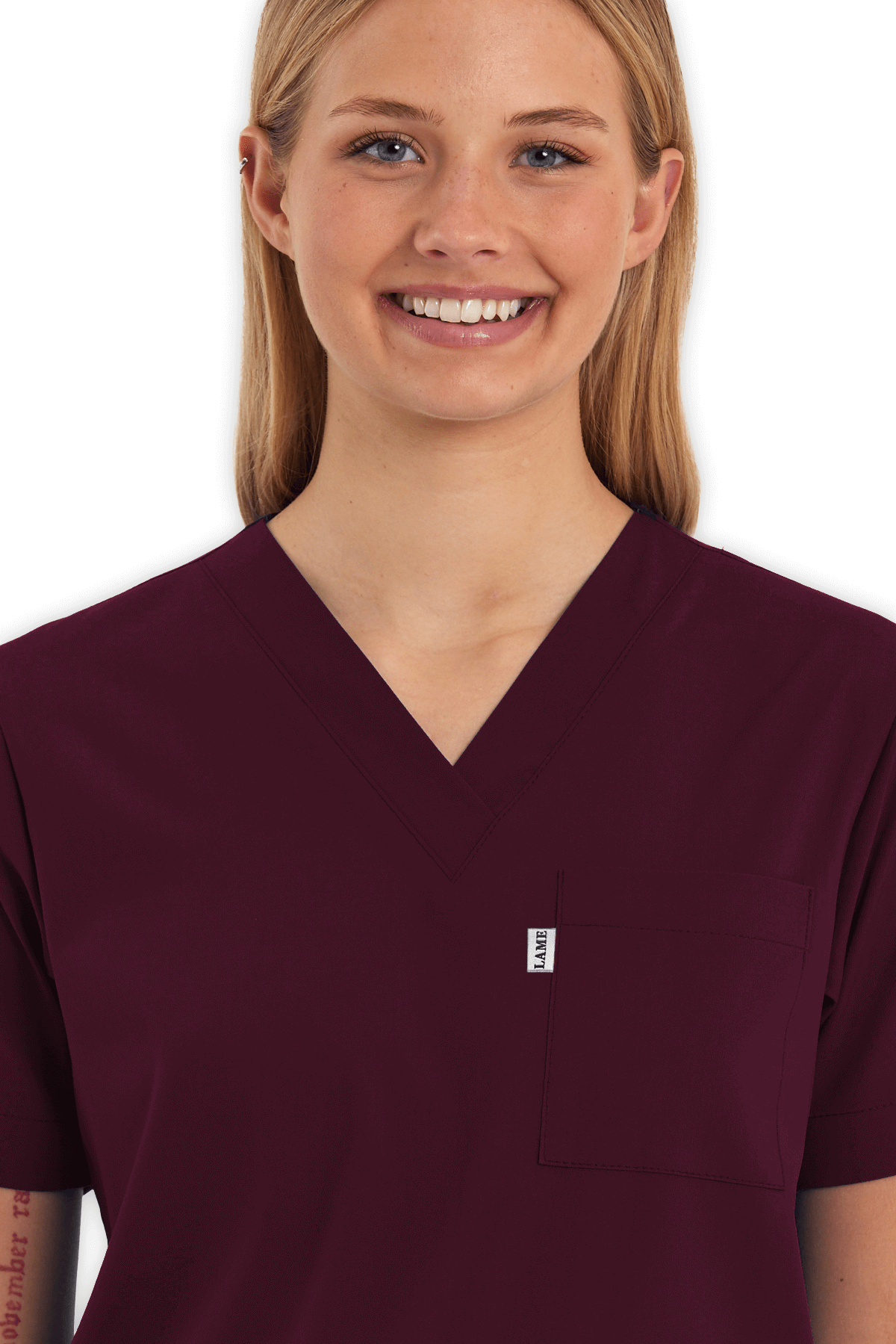 Modern Kadın Scrubs Üst – Bordo, V yaka tasarımı, 1 göğüs cebi, 2 alt cep ve yırtmaçlı yapısıyla hem şık hem kullanışlı. Yoğun tempo çalışan sağlık çalışanları için gün boyu konfor!