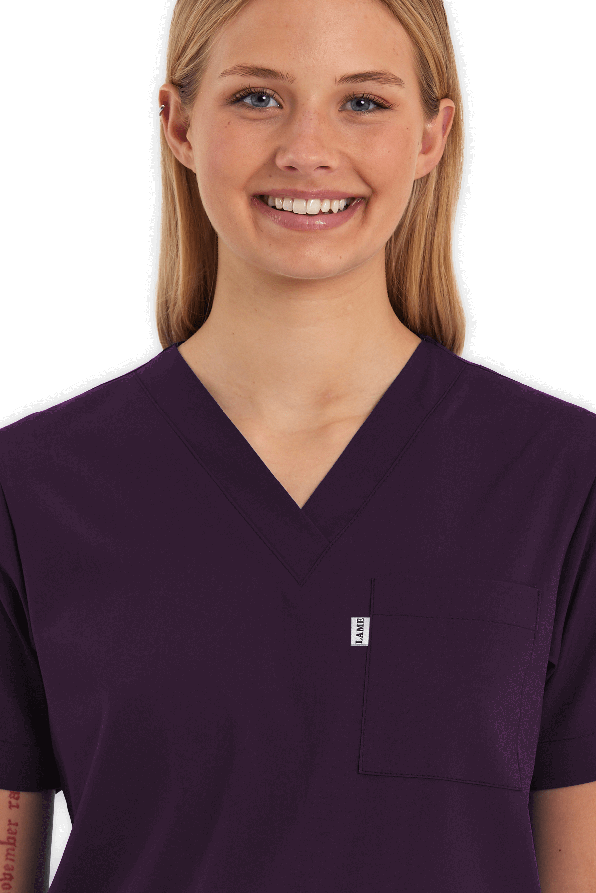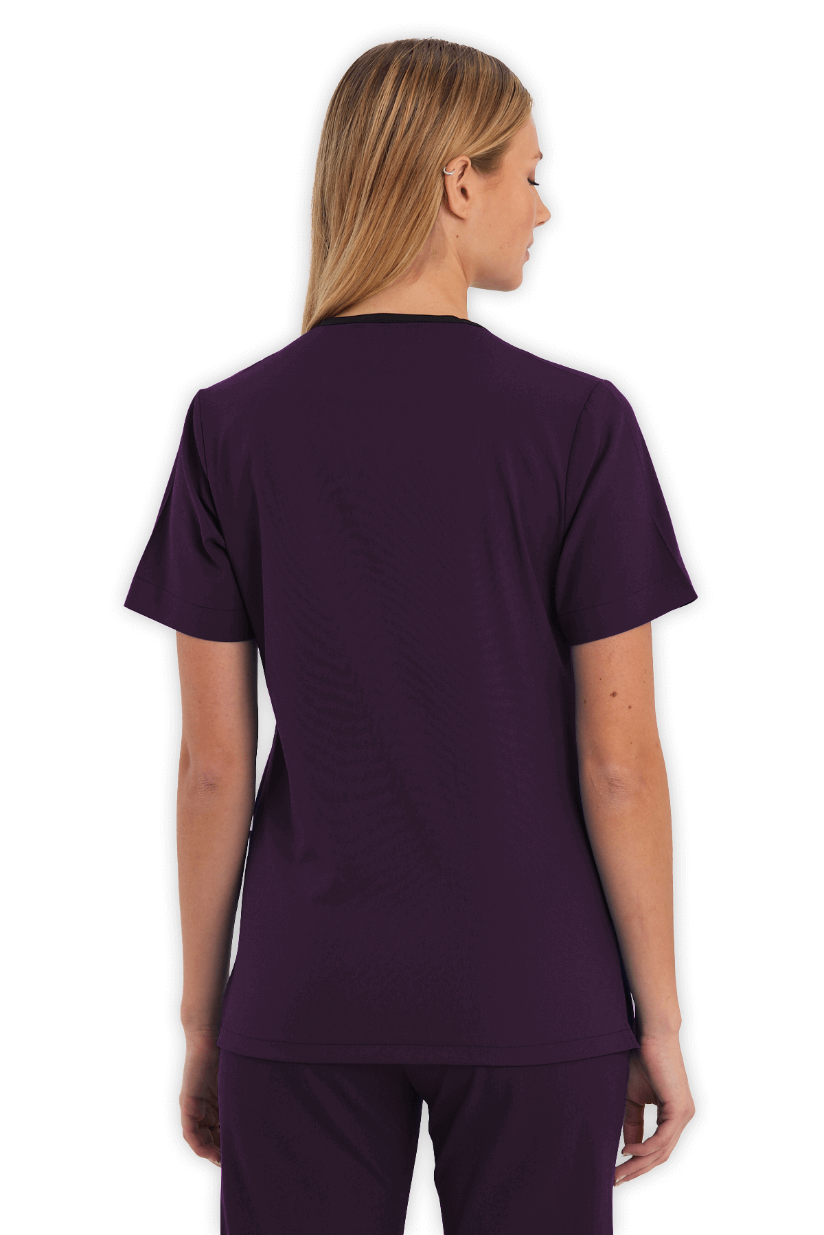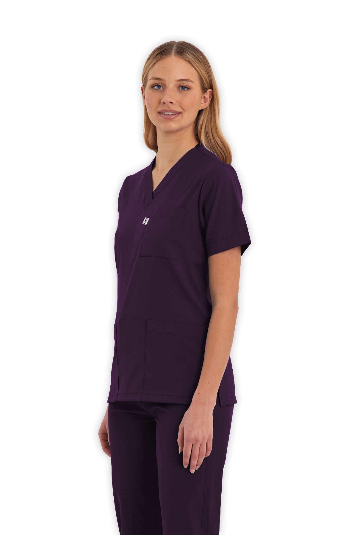 Modern Kadın Scrubs Üst – Mürdüm, V yaka tasarımı, 1 göğüs cebi, 2 alt cep ve yırtmaçlı yapısıyla hem şık hem kullanışlı. Yoğun tempo çalışan sağlık çalışanları için gün boyu konfor!