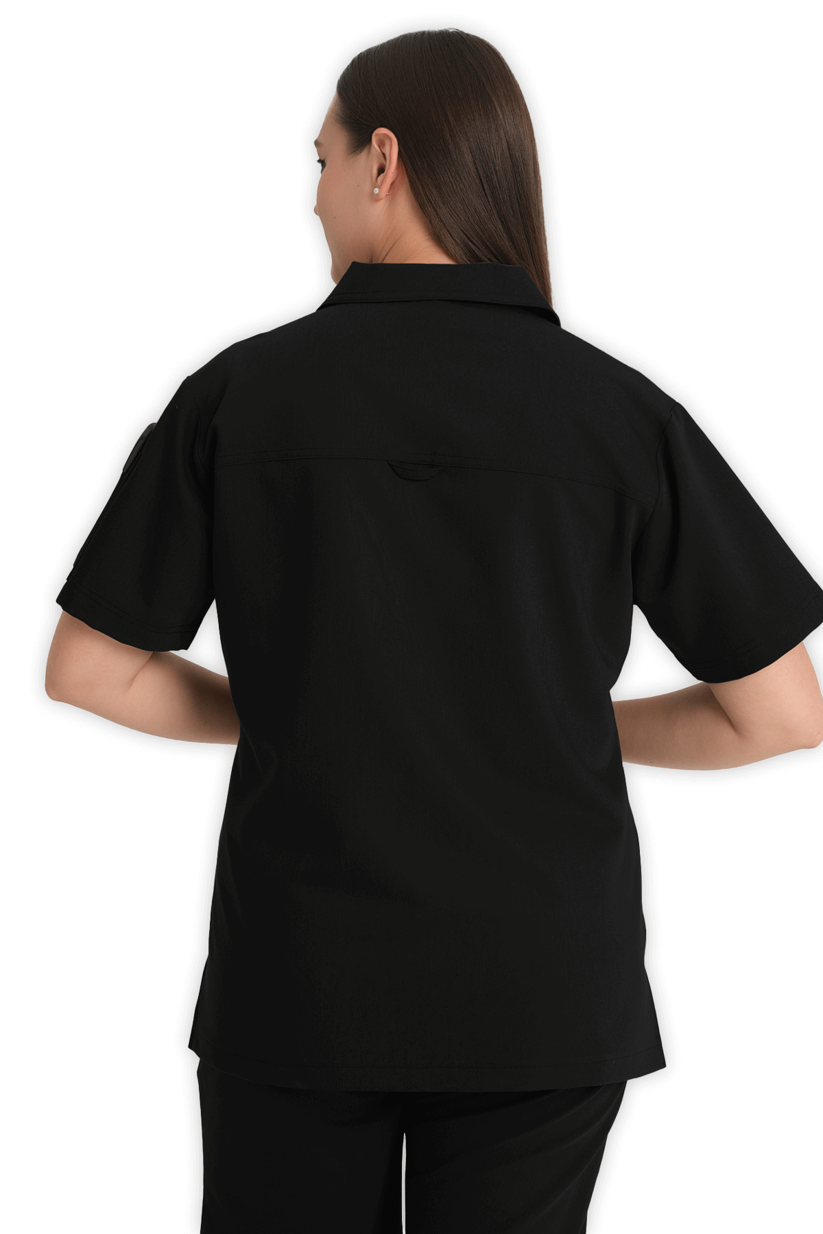 Modern Kadın Scrubs Üst Polo Yaka Fermuarlı – Siyah, kapaklı göğüs cebi, kol cebi ve yırtmaçlı tasarımıyla dikkat çeker. Fermuar detayı ile sağlık çalışanlarının 1 numaralı tercihi!