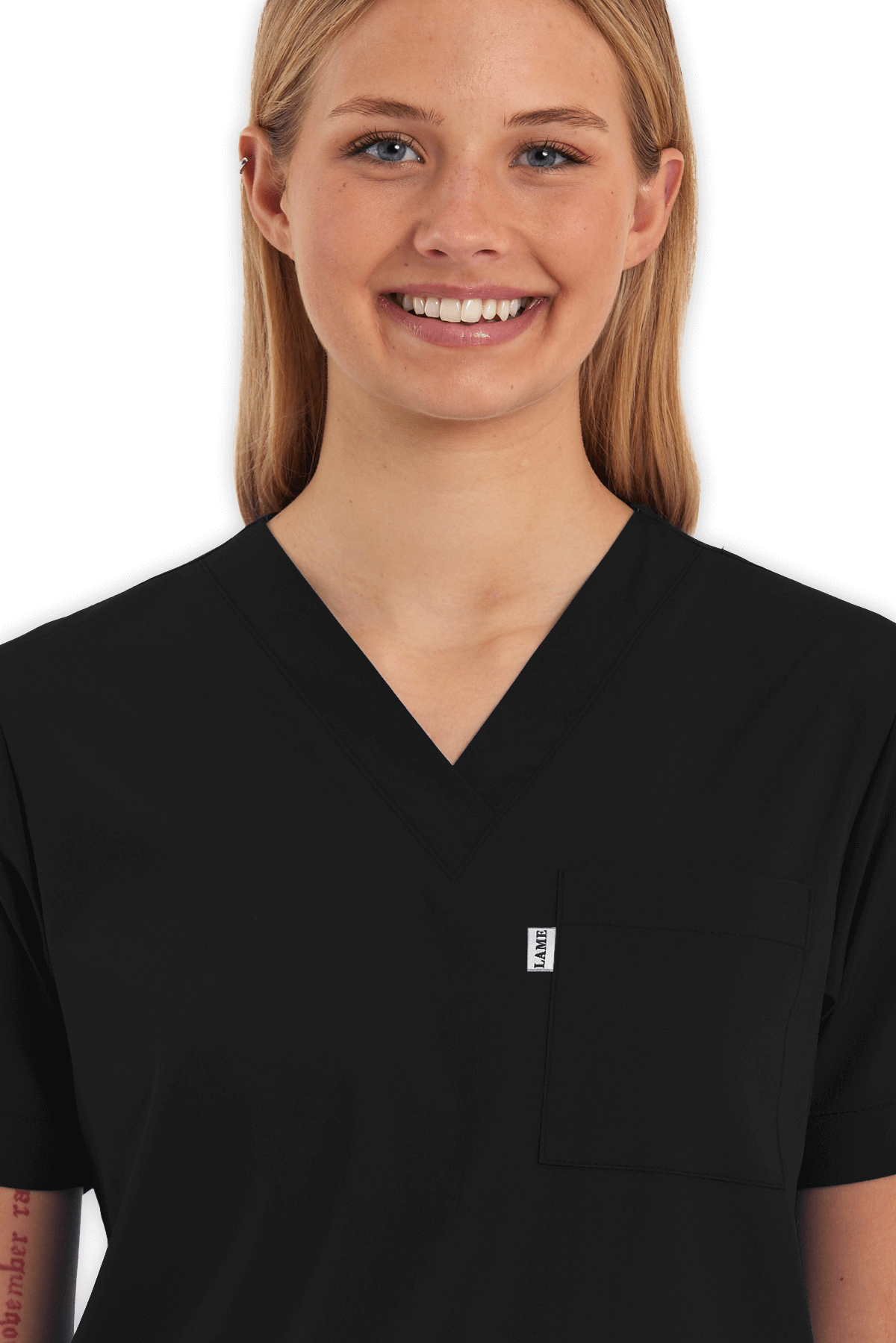 Modern Kadın Scrubs Üst – Siyah, V yaka tasarımı, 1 göğüs cebi, 2 alt cep ve yırtmaçlı yapısıyla hem şık hem kullanışlı. Yoğun tempo çalışan sağlık çalışanları için gün boyu konfor!