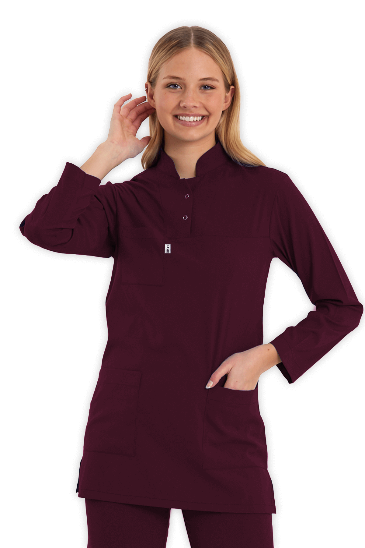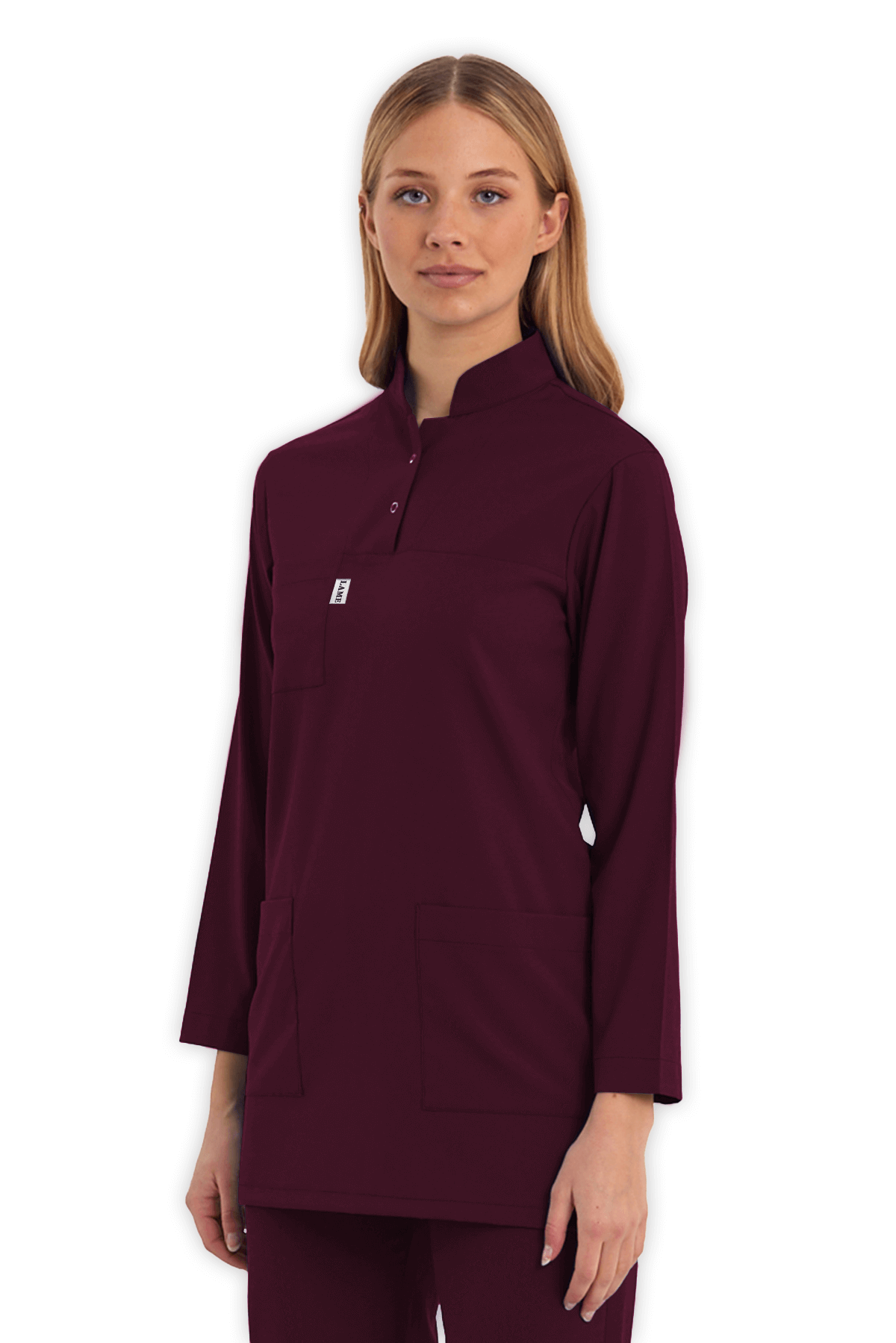 Konforlu Tesettür Scrubs Üst – Bordo, hakim yaka, uzun kol ve tunik boy tasarımıyla şıklık sunar. 1 göğüs cebi, 2 alt cep ve yırtmaçlı yapısıyla sağlık çalışanları pratik ve zarif tasarım!