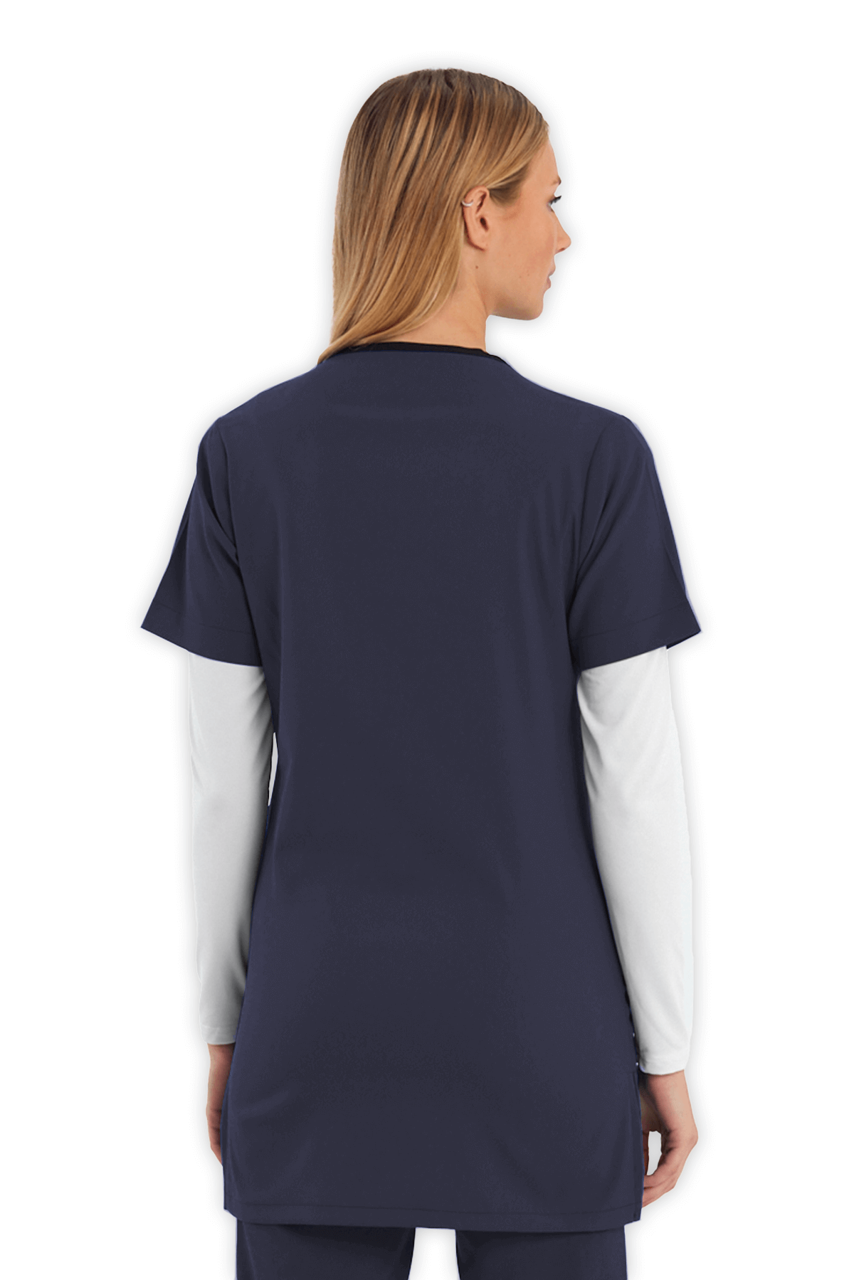 Rahat Tunik Scrubs Üst – Antrasit, V yaka ve tunik boy tasarımıyla öne çıkar. 1 göğüs cebi, 2 alt cep ve yırtmaçlı yapısıyla sağlık çalışanları için hem şık hem pratik!